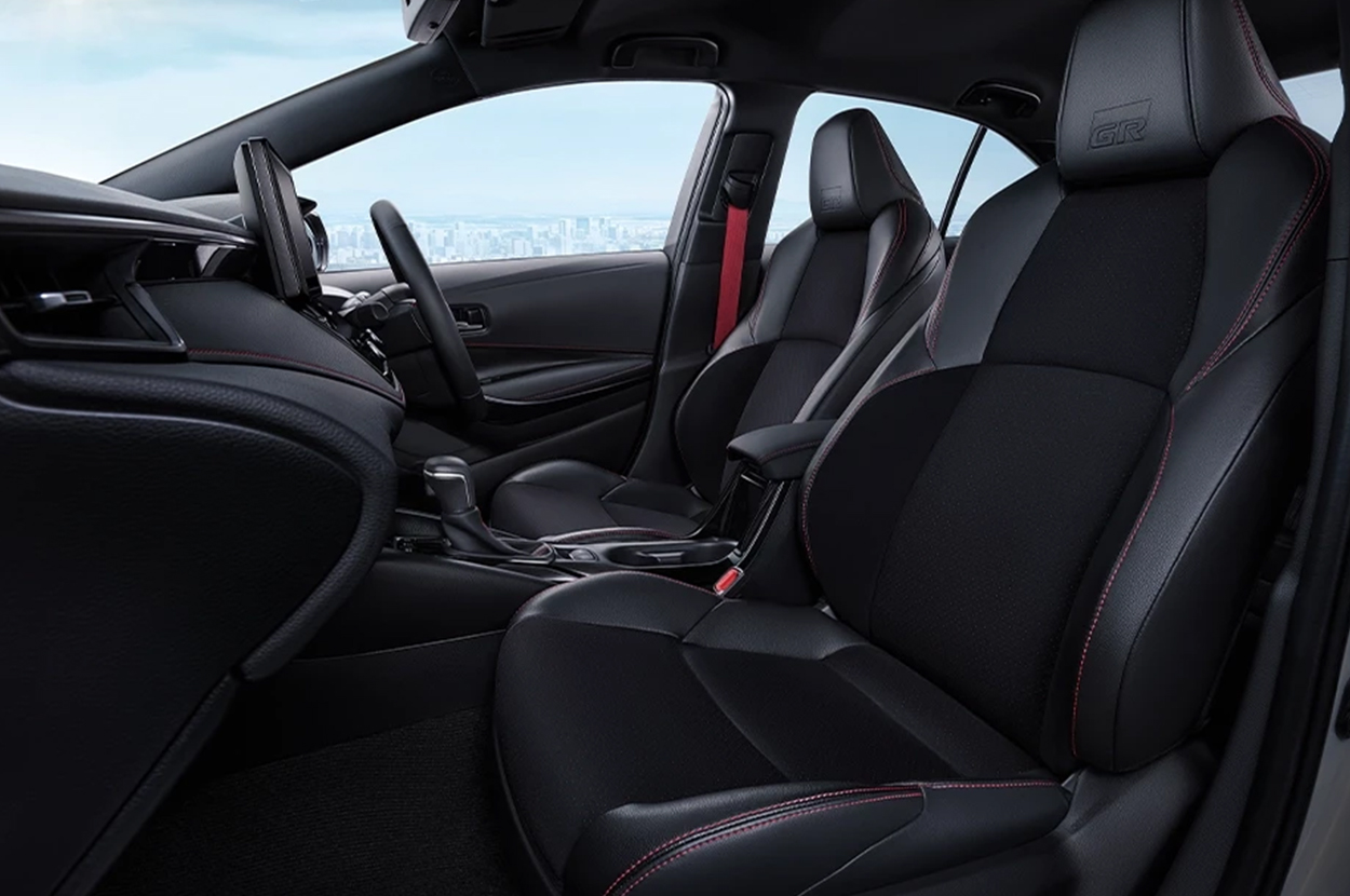 – ใหม่.. เบาะนั่งคู่หน้าทรงสปอร์ต หนัง Suede แบบเจาะรูและหนังสังเคราะห์ เดินด้ายสีแดง พร้อมสัญลักษณ์ GR ปรับ ไฟฟ้า 8 ทิศทาง และ Lumbar Support แบบไฟฟ้า