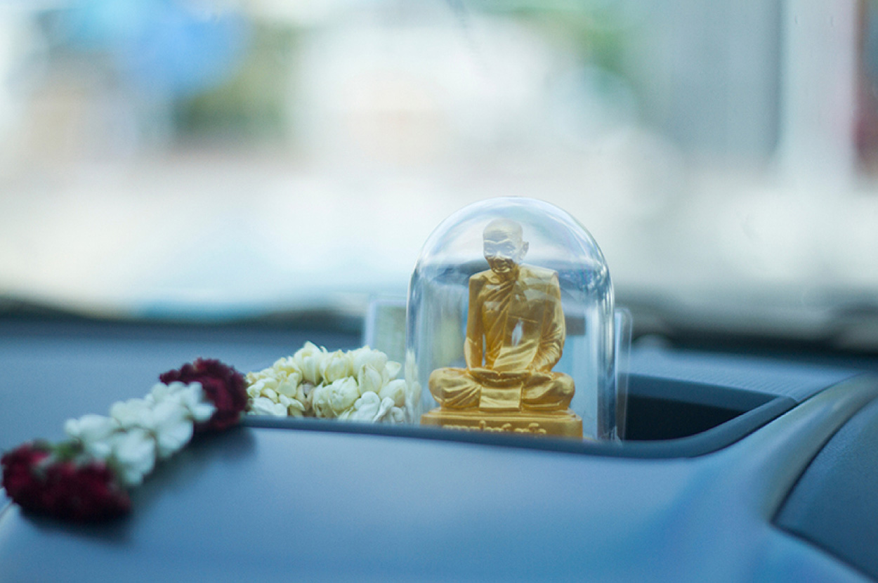 3.วัตถุมงคลของต้องมี อันนี้ต้องบอกว่าขึ้นอยู่กับความเชื่อของต่ละบุคคล โดยตามหลักของฮวงจุ้ย รถยนต์คือธาตุดิน ของมงคลส่วนใหญ่จึงควรเป็นวัตถุที่ทำมาจากดิน เช่น พระพุทธรุป จี้หยก พระองค์เล็กๆ ก็ได้ซึ่งสามารถวางหันออกหน้ารถหรือหันเข้าหาคนขับก็ได้ตามสะดวก ทั้งนี้จุดประสงค์สำคัญของการมีวัตถุมงคลก็เพื่อเตือนสติเวลาขับขี่นั่นเอง