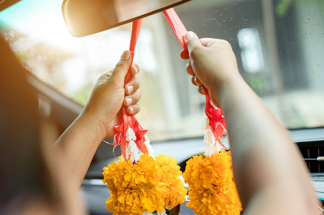 1. จัดเตรียมของไหว้วางไว้บนโต๊ะไหว้หน้ารถให้เรียบร้อย (การตั้งโต๊ะควรเว้นระระห่างจากรถให้เหมาะสม เพราะหากชิดเกินไป อาจเกิดอันตรายกับตัวรถได้) จากนั้นให้ทำการสตาร์ทเครื่องยนต์ บีบแตร 3 ที เพื่อเอาฤกษ์เอาชัย