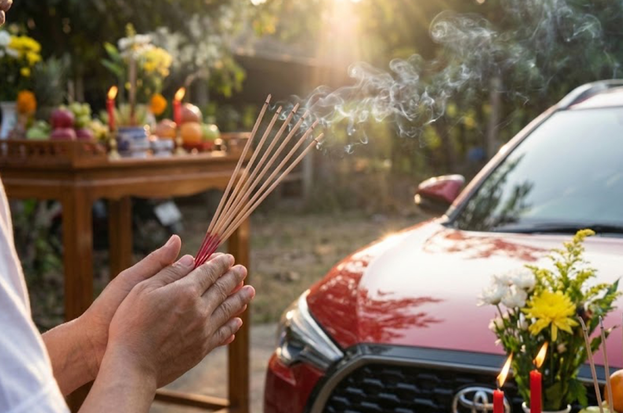 เคล็ด: จุดธูป 9 ดอก ตั้งจิตอธิษฐานให้เดินทางปลอดภัย ไร้อุบัติเหตุ และให้รถคันใหม่เป็นพาหนะนำพาชีวิตไปสู่ความเจริญรุ่งเรือง