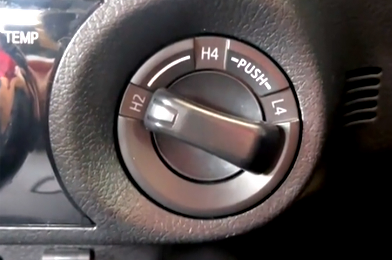 3.แบบเรียลไทม์ (Real Time) ขับเคลื่อน 4 ล้อแบบอัตโนมัติ แบบนี้ระบบจะทำการควบคุมโดยอัตโนมัติ ในการขับปกติทั่วไประบบจะส่งกำลังไปที่ 2 ล้อหลังเป็นหลัก แต่หากพบว่าล้อหน้ามีการลื่นไถลจะส่งกำลังไปที่ล้อหน้า ส่วนการใช้เกียร์ในการขับขึ้น-ลงเขา ของรถขับเคลื่อน 4 ล้อ จะใช้งานเหมือนรถขับเคลื่อน 2 ล้อทั่วไป คือใช้ต่ำแหน่งเกียร์ให้เหมาะสมทางลาดชัน ถ้าชันมากต้องใช้เกียร์ต่ำในการขับลงเขา ในส่วนของตำแหน่ง L4, LL แบบขับเคลื่อน 4 ล้อความเร็วต่ำแบบนี้ จะใช้ในกรณีทางวิบากเท่านั้น เช่น ทางหล่มทรายถนนที่เป็นโคลนหรือโขดหิน ครับ