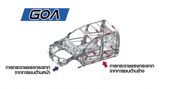 โครงสร้างตัวถังนิรภัย GOAคนส่วนมากมักคิดว่ารถที่ชนแล้วตัวถังด้านหน้าหรือหลังยุบหนัก คือรถที่ไม่มีคุณภาพ แต่ความจริงแล้ว”ไม่ใช่” เพราะเป็นความตั้งใจในการออกแบบให้ส่วนที่ยุบนั้นทำหน้าที่ดูดซับแรงกระแทกจากการชนเพื่อลดความเสียหายต่อห้องโดยสาร การออกแบบและพัฒนาโครงสร้างตัวถังที่ดีจึงเป็นส่วนสำคัญมากต่อการปกป้องผู้ขับ และผู้โดยสารเมื่อเกิดอุบัติเหตุ เพราะเหตุนี้