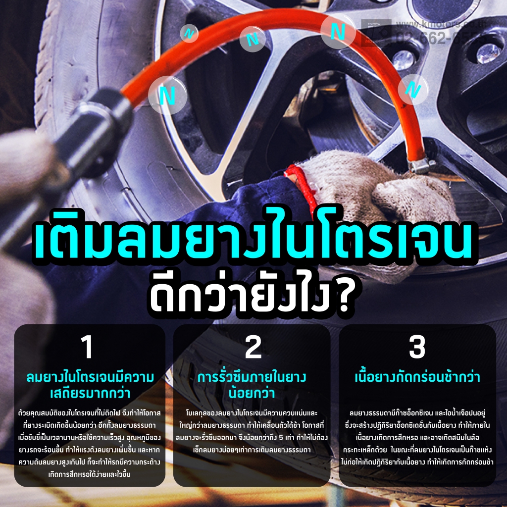 เคยสงสัยกันไหมครับว่าเวลานำรถเข้าศูนย์บริการทำไมช่างมักจะแนะนำให้เติมลมยางไนโตรเจนแทนการเติมลมยางแบบทั่วไป ทั้งนี้ก็เพราะเมื่อยางรถยนต์ถูกเติมด้วยลมยางไนรโตรเจนจะมีความเสถียรมากขึ้น รั่วซึ่มน้อยลง และกัดกร่อนเนื้อยาง นั่นก็หมายความว่ายางรถยนต์ของคุณจะมีอายุใช้งานที่ยาวนานและคงทนนั่นเอง