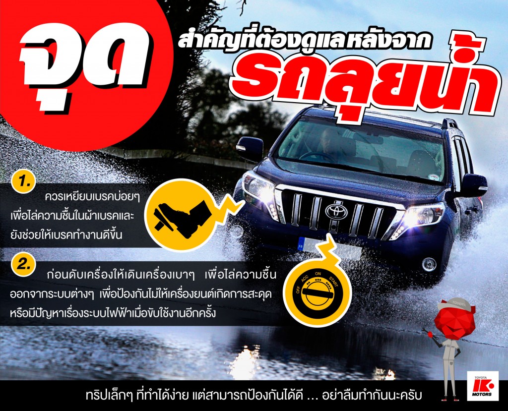 อย่างไรก็แล้วแต่เมื่อรถของคุณผ่านการลุยน้ำมาแล้ว ต้องรีบดูแลและทำความสะอาดให้ไวเลยนะครับ เพราะถ้าปล่อยทิ้งไว้นาน ๆ รถของคุณอาจจะเกิดปัญหาสะสม จนไม่สามารถแก้ไขได้ง่าย ๆ อีก