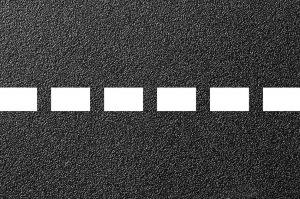 5. เส้นแบ่งช่องเดินรถปกติ เส้นประสีขาวกว้าง 10 ยาว 100 เว้นช่องห่าง 300 เซนติเมตร ห้ามขับคร่อมเส้นหรือทับเส้น เว้นแต่จะเปลี่ยนช่องเดินรถหรือกลับรถเมื่อปลอดภัย