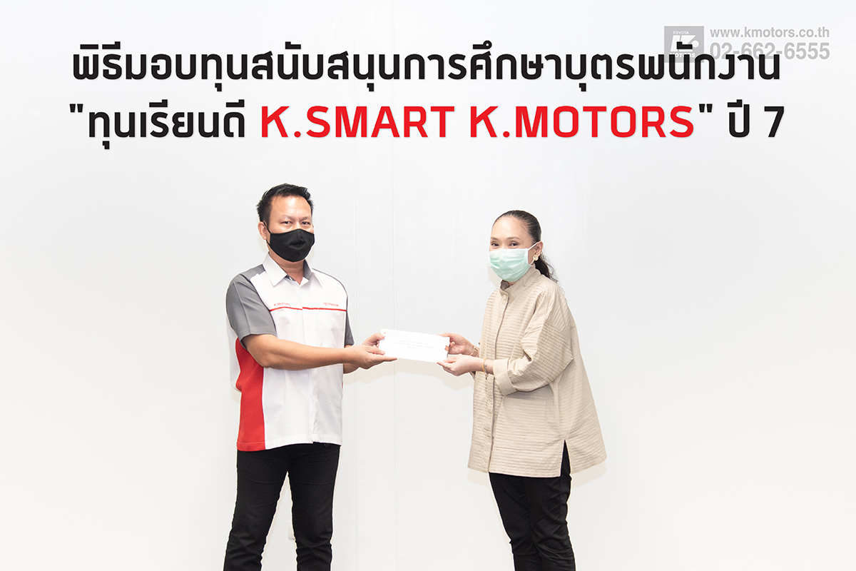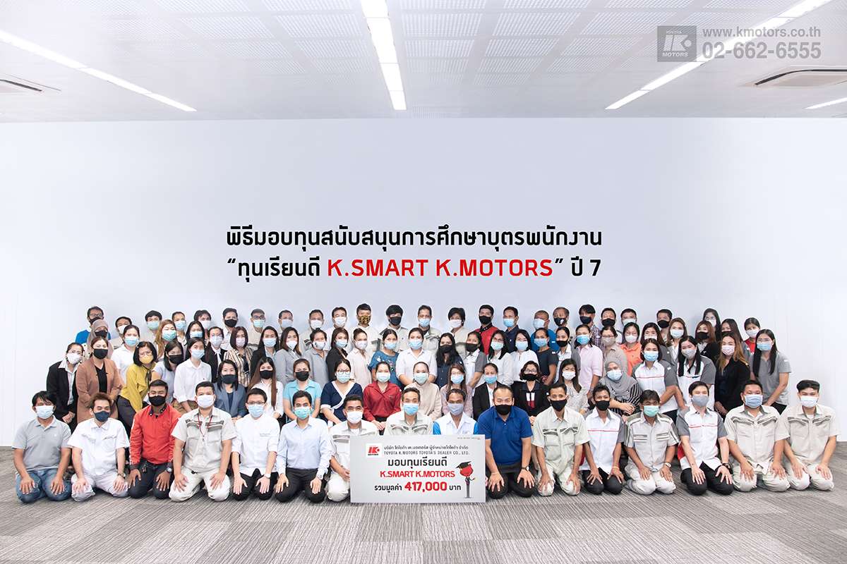 เค.มอเตอร์ส นำโดยคุณสุกุมล สมภพรุ่งโรจน์ รองกรรมผู้จัดการ บริษัท โตโยต้า เค.มอเตอร์ส ผู้จำหน่ายโตโยต้า จำกัด เป็นตัวแทนคณะผู้บริหาร มอบทุนการศึกษาแก่บุตรพนักงาน ในโครงการ “ทุนเรียนดี K.SMART K.MOTORS” ปี 7 เพื่อส่งเสริมสนับสนุน และสร้างขวัญกำลังใจให้แก่บุตรพนักงาน ได้เติบโตขึ้นด้วยคุณภาพและเป็นอนาคตที่ดีของชาติต่อไป