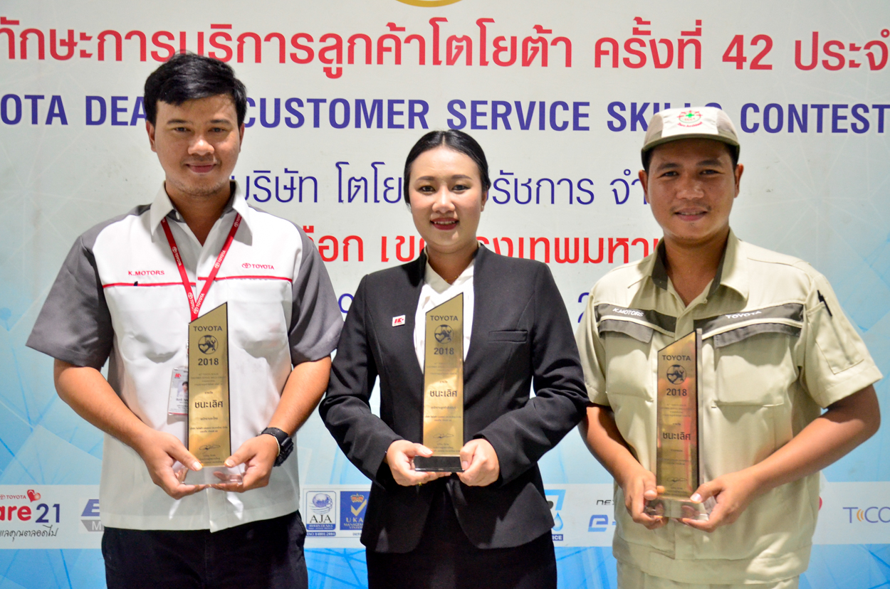 การแข่งขันทักษะการบริการลูกค้าโตโยต้า “42ST Toyota Dealer Customer Service Skills Contest 2018” ถือเป็นสนามประลองความสามารถสุดยิ่งใหญ่แห่งปี ที่รวมดีเลอร์จากทั่วทุกสารทิศมาแข่งขันกัน และคัดผู้เข้าแข่งขันที่ดีที่สุดไปแข่งขันรอบชิงชนะเลิศ โดยรอบคัดเลือกปีนี้ โตโยต้า เค.มอเตอร์ส ก็ไม่ทำให้ผิดหวังคว้า  3 รางวัล จากการเข้าแข่งขันทั้งหมด 5 ประเภท ดังนี้