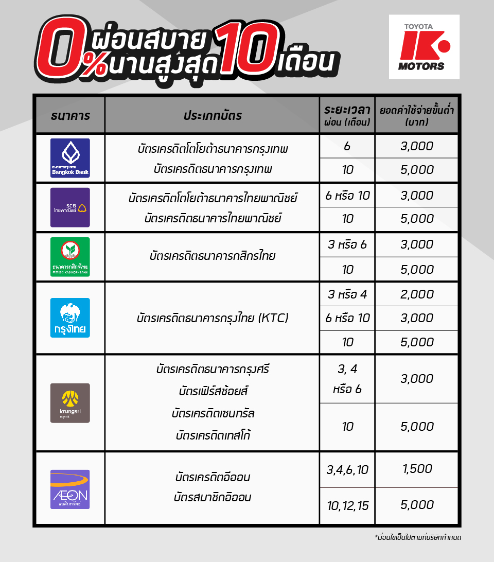 เพื่อความสะดวกสบายของลูกค้า ศูนย์บริการ โตโยต้า เค.มอเตอร์ส ทั้ง 17 สาขา จึงมอบสิทธิพิเศษสำหรับผู้ถือบัตรเครดิตของธนาคารกรุงเทพ ธนาคารกรุงไทย ธนาคารไทยพาณิชย์ ธนาคารกสิกรไทยและธนาคารกรุงศรีอยุธยา ให้คุณจ่ายง่าย ใช้คล่อง สามารถผ่อนชำระค่าบริการ 0% นานถึง 10 เดือน รวมถึงบริการงานซ่อมทั่วไป รวมค่าแรง ค่าอะไหล่ งานซ่อมตัวถังและและสีที่มีมูลค่าขั้นต่ำตามที่แต่ละธนาคารกำหนด ความคุ้มค่าที่มาพร้อมความสะดวกสบายแบบนี้ ใครที่ถือบัตรเครดิตข้างต้น รูดปรืดสบายๆ แน่นอนครับบบบ