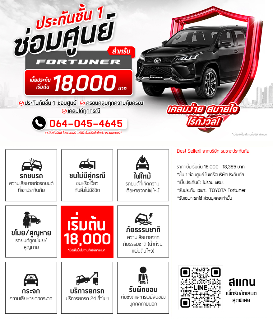 ประกันภัยชั้น 1 สุดคุ้ม สำหรับรถยนต์ Fortuner เบี้ยเริ่มต้น 18,000 บาท